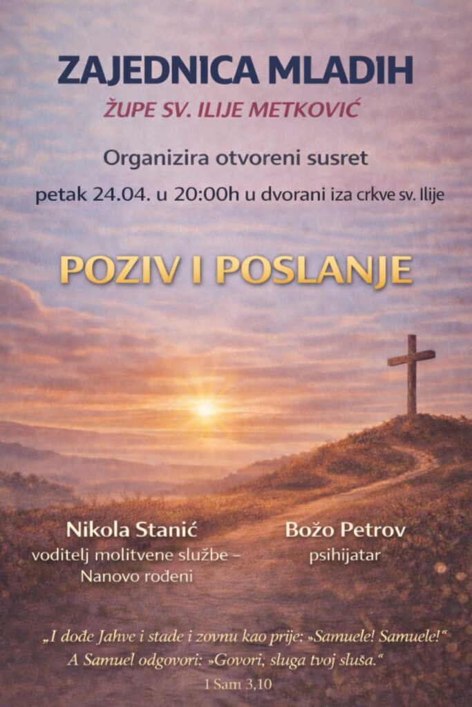 Zajednica mladih pri Župi sv. Ilije poziva te na otvoreni susret! Petak u 20:00Dvorana iza crkve sv. Ilije TEMA: POZIV I POSLANJE Govore: Nikola Stanić (Nanovo rođeni) Božo Petrov, psihijatar 💬 Jesi li se ikad pitao:Je li to poziv – ili samo moja želja? 👉 Kako prepoznati Božji poziv?👉 Što znači imati poslanje?👉 Ima li […]