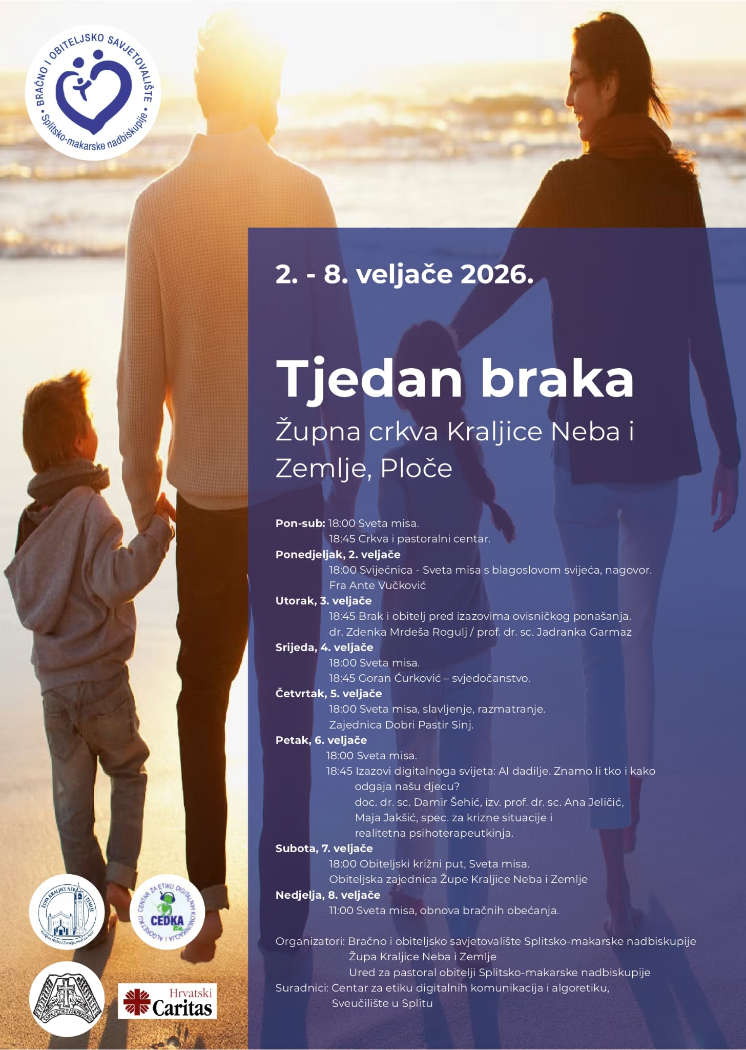 Svake večeri, nakon svete mise u 18:00 sati, slijedi prigodan duhovno-formativni program, dok Tjedan braka završava u nedjelju, 8. veljače, svetom misom u 11:00 sati i obnovom bračnih obećanja. Svi su dobrodošli produbiti svoj bračni i obiteljski život u zajedništvu, molitvi i razgovoru.